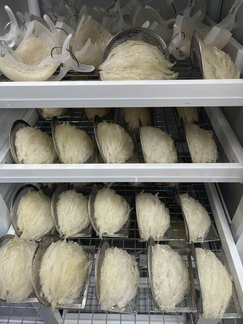 Yến được ủ ẩm, tách riêng phần bụng yến và sợi dài, rửa với nước lọc sau đó nhặt sạch lông và tạp chất. Sau khi đã làm sạch lông, các sợi yến được xếp lại vào khuôn và sấy khô bằng máy sấy lạnh.